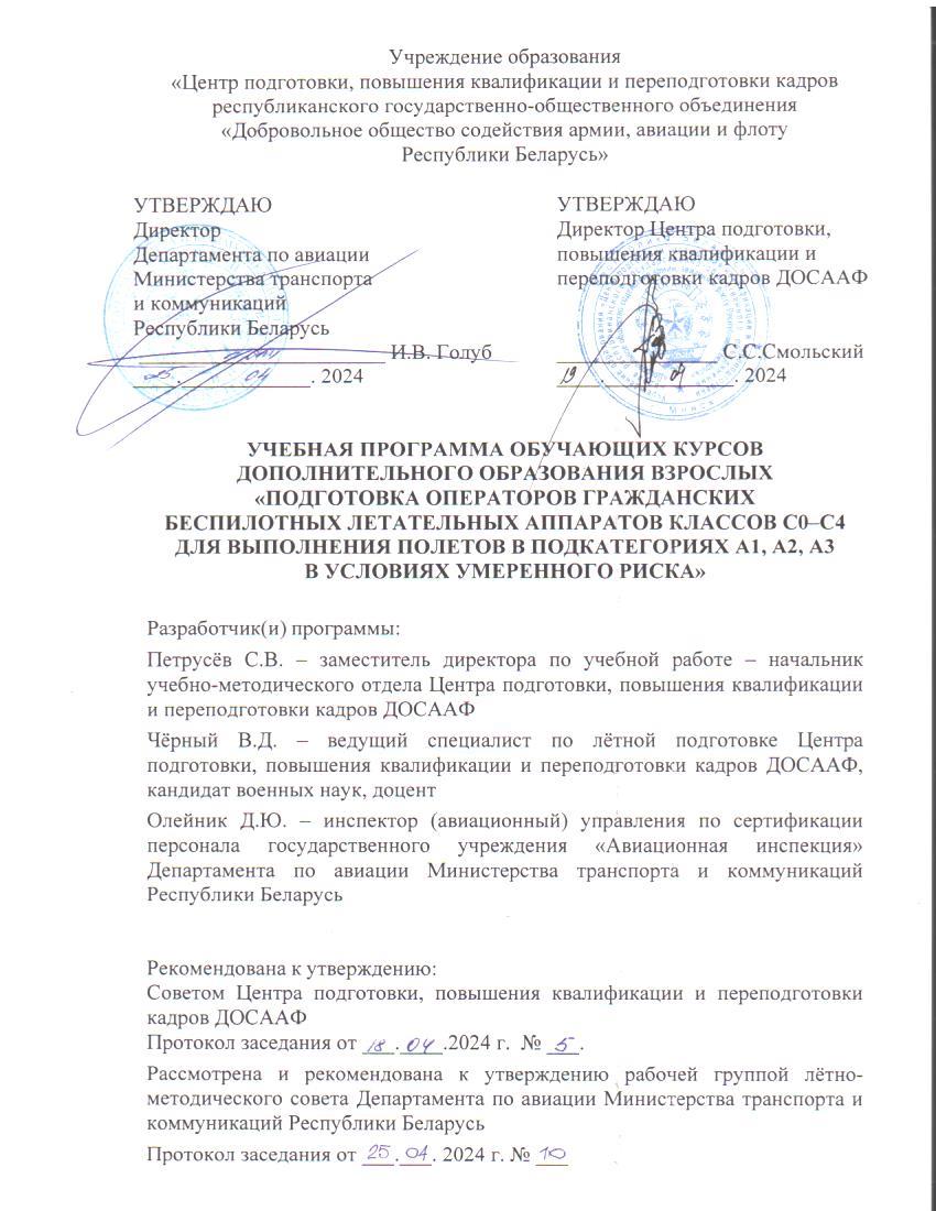 Учебная программа обучающих курсов дополнительного образования взрослых «Подготовка операторов гражданских беспилотных летательных аппаратов классов С0 — С4 для выполнения полетов в подкатегориях А1, А2, А3 в условиях умеренного риска» разработана с учётом требований Указа Президента Республики Беларусь 25 сентября 2023 г. № 297 «О государственном учете и эксплуатации гражданских беспилотных летательных аппаратов» и Постановления Совета Министров Республики Беларусь от 28 декабря 2023 г. № 972 (в ред. ПСМ от 23.10.2024 № 784) «О вопросах государственного учета и эксплуатации гражданских беспилотных летательных аппаратов» и утверждена Департаментом по авиации Министерства транспорта и коммуникаций Республики Беларусь.